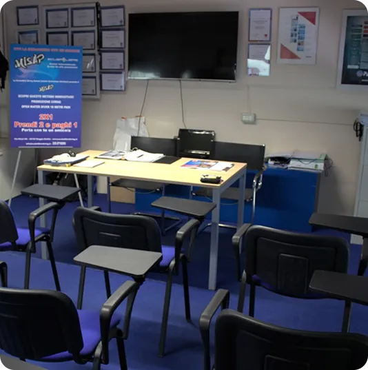 La nostra aula è attrezzata con materiali PADI aggiornati, proiettori HD e tutto quello che serve per capire realmente i principi della subacquea. Non memorizzi: comprendi.